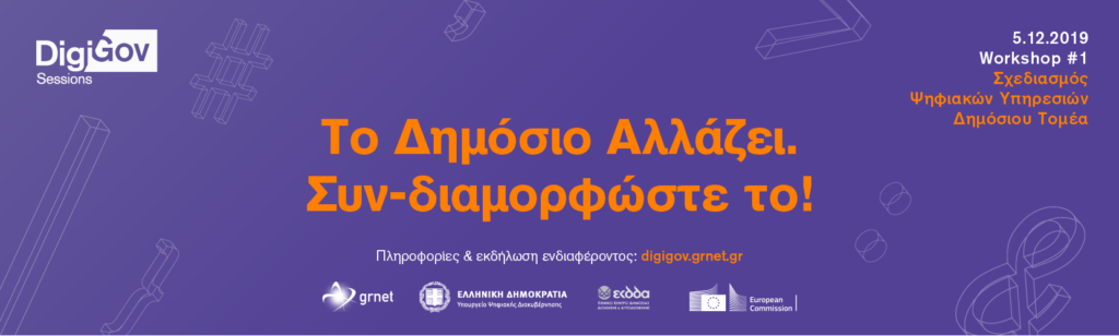 Workshop #1:Σχεδιασμός Ψηφιακών Υπηρεσιών Δημόσιου Τομέα Ξεκινά ο κύκλος εργαστηρίων σχεδιασμού για τον Ψηφιακό Μετασχηματισμό του Δημόσιου Τομέα, υπό τον τίτλο “DigiGov Sessions”, με το πρώτο workshop να πραγματοποιείται στις 5 Δεκεμβρίου 2019, στην Αθήνα. Με θέμα “Σχεδιασμός Ψηφιακών Υπηρεσιών του Δημόσιου Τομέα”, το πρώτο εργαστήρι του κύκλου στοχεύει στον εντοπισμό και την αποτύπωση των […]