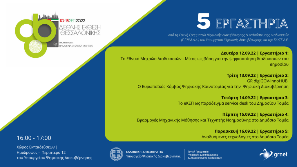 Αναλυτικό πρόγραμμα Δευτέρα 12.09.22 | Εργαστήριο 1: Το Εθνικό Μητρώο Διαδικασιών – Μίτος ως βάση για την ψηφιοποίηση διαδικασιών του Δημοσίου Στο εργαστήριο θα αναδειχθεί το ΕΜΔ ως βασικός πυλώνας της Εθνικής Πολιτικής Διοικητικών Διαδικασιών και θα παρουσιαστει ο τρόπος με τον οποίο η αναλυτική καταγραφή των διαδικασιών μπορεί να αξιοποιηθεί για την ψηφιοποίηση των […]