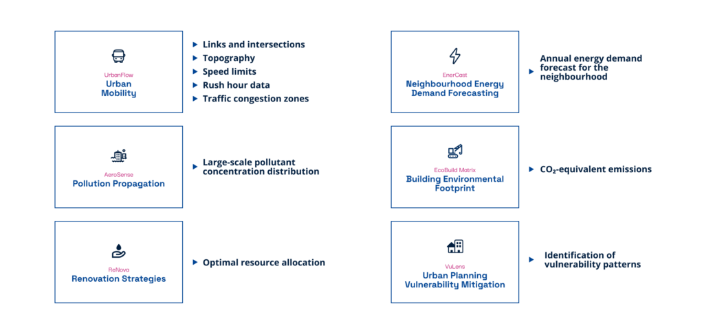 Τα δεδομένα που περιλαμβάνει —από τύπους κτιρίων και υλικά κατασκευής έως συστήματα θέρμανσης, U-values, κόστος ανακαίνισης και μοτίβα πληθυσμιακής κινητικότητας— επιτρέπουν στους δήμους να κατανοήσουν με ακρίβεια την ενεργειακή, περιβαλλοντική και κοινωνική κατάσταση του αστικού ιστού. Με αυτόν τον τρόπο καθίσταται δυνατός ο σχεδιασμός στοχευμένων παρεμβάσεων για τη μείωση εκπομπών, την αύξηση της ενεργειακής αποδοτικότητας και τον καλύτερο αστικό μετασχηματισμό.