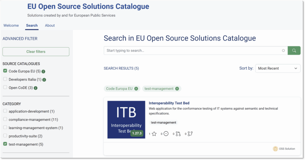 Στο πλαίσιο αυτό, τα αποθετήρια της ITB επικαιροποιήθηκαν με τα απαραίτητα μεταδεδομένα publiccode.yml, γεγονός που επέτρεψε την ομαδοποίησή τους στον κατάλογο OSS της ΕΕ. Έτσι, από τον Αύγουστο του 2025, οι λύσεις της ITB καταγράφονται στον κατάλογο ως επαναχρησιμοποιήσιμες εφαρμογές για τη διαχείριση δοκιμών.
