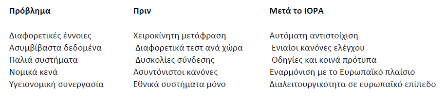 Το IOPA οργανώνει τις πληροφορίες σαν ένα «έξυπνο Excel» που μπορούν να καταλάβουν αυτόματα και τα συστήματα άλλων χωρών. Περιλαμβάνει: